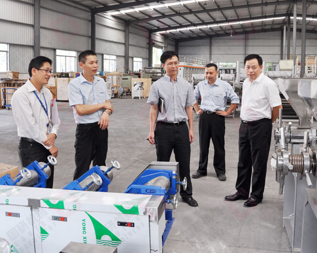 李局長一行來到公司就深入車間了解生產(chǎn)情況,在河粉機裝配車間李局長詳細詢問了河粉機的功能原理和價格,當?shù)弥獓信坪臃蹤C占領(lǐng)了國內(nèi)主要市場時十分高興。李局長一行還在公司黨支部活動室觀看了廣州電視臺播出的報道我司開展黨建工作的《紅棉璀璨》專題節(jié)目,隨后開展了討論,對我司黨建工作開展的有聲有色給予了高度評價。