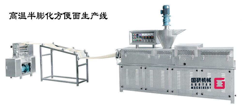 高溫半膨化非油炸方便面生產(chǎn)線,是集自動和面、自動加料、擠壓膨化、面片冷卻輸送、自動切條、分行輸送自動提升、加濕回軟切斷、自動落盒成形、自動干燥到成品輸送入包裝于一體的全自動生產(chǎn)線。該設備主要應用于擠出式非油炸快食面的生產(chǎn),工藝流暢、功能齊全、自動化程度高,機器出品穩(wěn)定,工藝技術強于國內(nèi)同類生產(chǎn)設備,是油炸方便面廠家更新?lián)Q代的理想選擇。